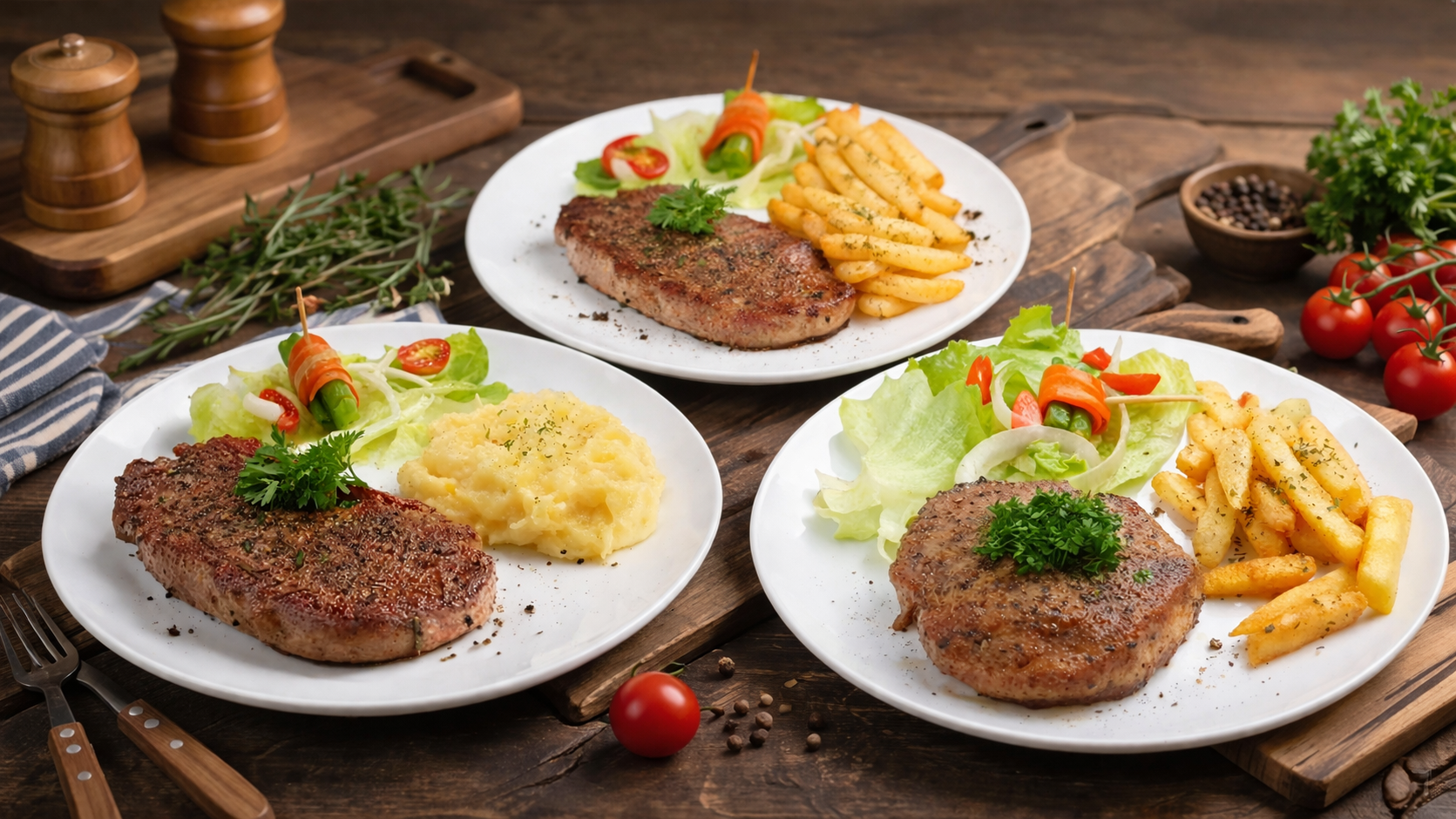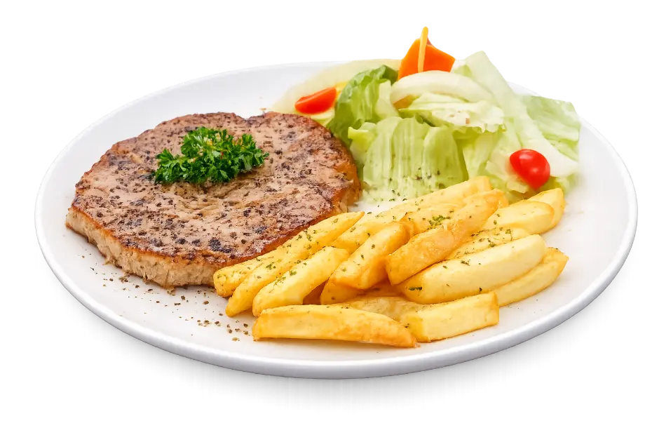 - Daging sapi pilihan ± 200 gr yang diolah dengan teknologi untuk membuat teksturnya lebih empuk dan lembut yang disajikan bersama pilihan kentang goreng / mashed potato dan sayuran segar
