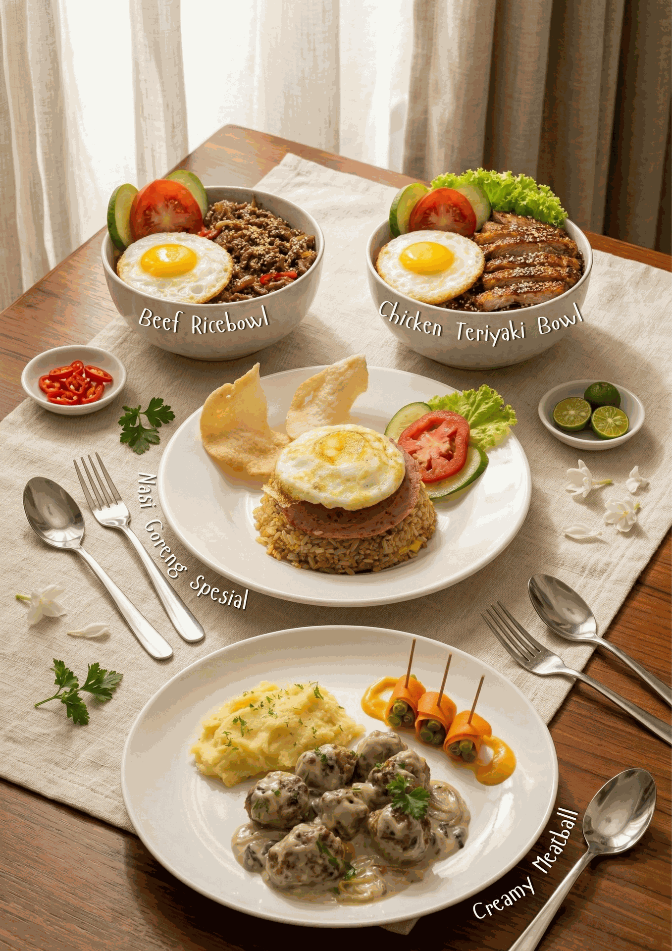 - Creamy Meatball 75K Meatball juicy disajikan dengan homemade Creamy Mushroom Sauce, dilengkapi Mash Potato dan sayuran