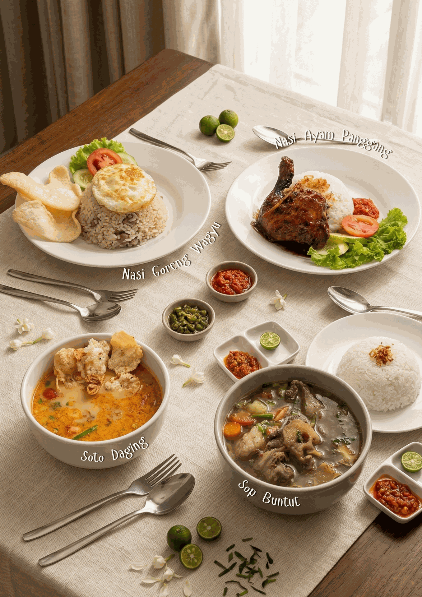 - Sop Buntut 95K Hidangan sup hangat kuah bening dengan potongan buntut sapi yang empuk disajikan bersama nasi, emping dan sambal